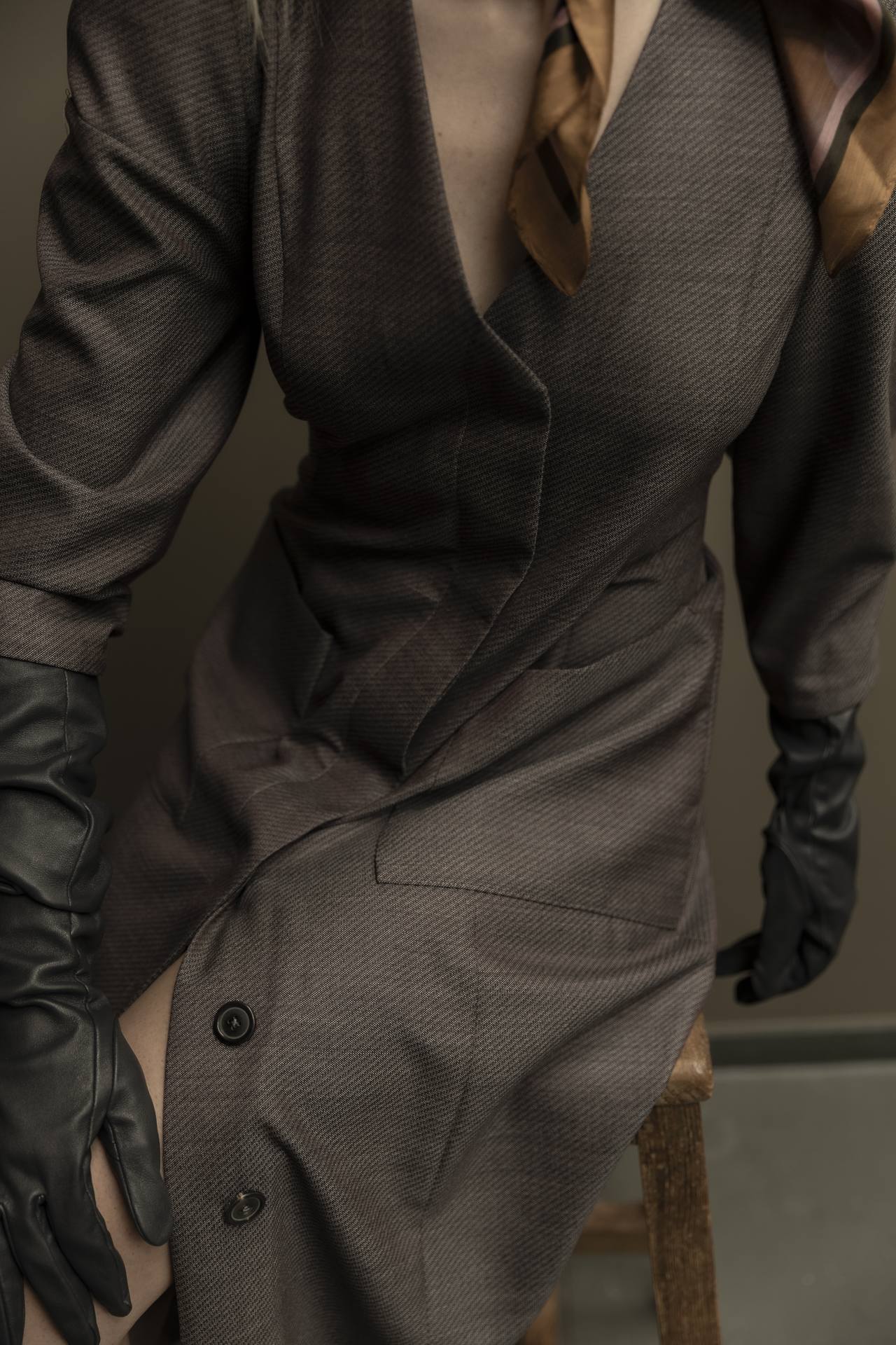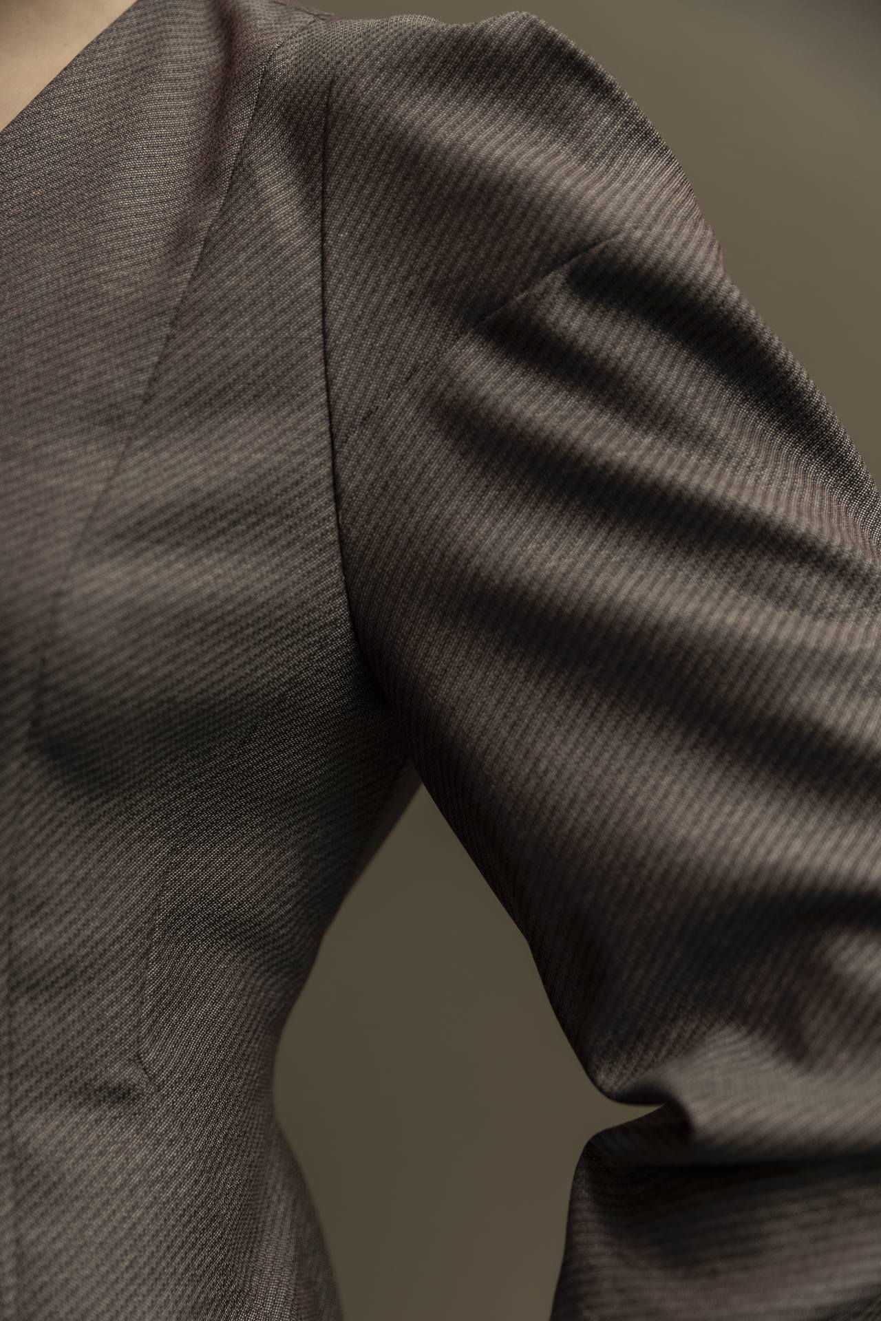 Mit seinen raffinierten Details, der klaren, taillierten Silhouette hat dieses Kleid eine starke Präsenz, die durch den feinen, changierenden Wollstoff noch betont wird.