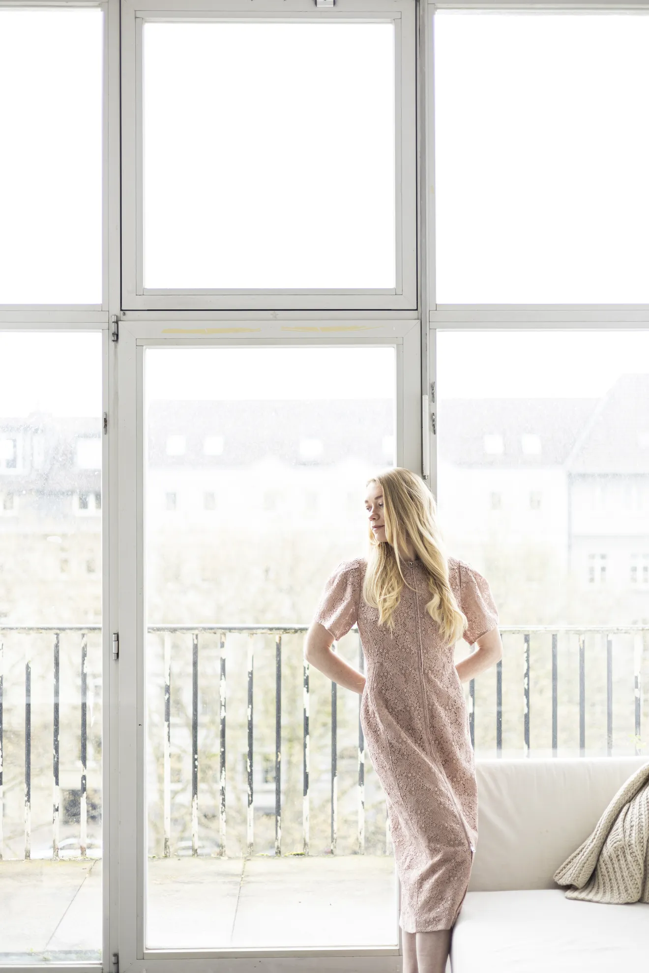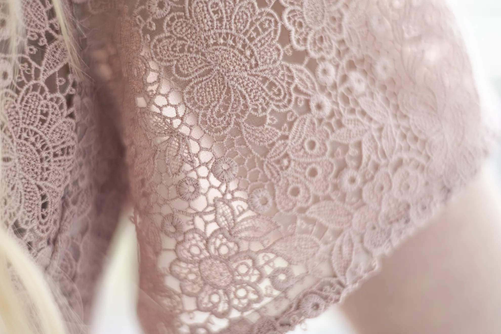 Tailliertes Etuikleid in zartem Altrosa aus fein unterlegter Spitze. Baumwolle/Seide